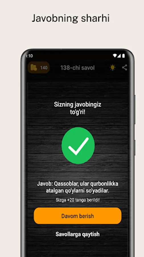 ✔️ Har bir toʻgʻri javob uchun tanga beriladi