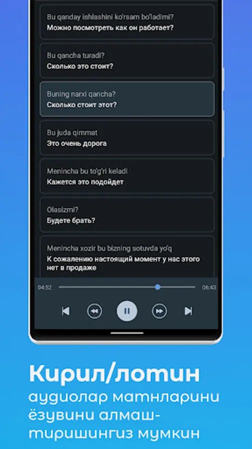 Ruscha - Uzbekcha audio dialoguelar - matnlari bilan ham kiril va ham lotin yozuvlarida