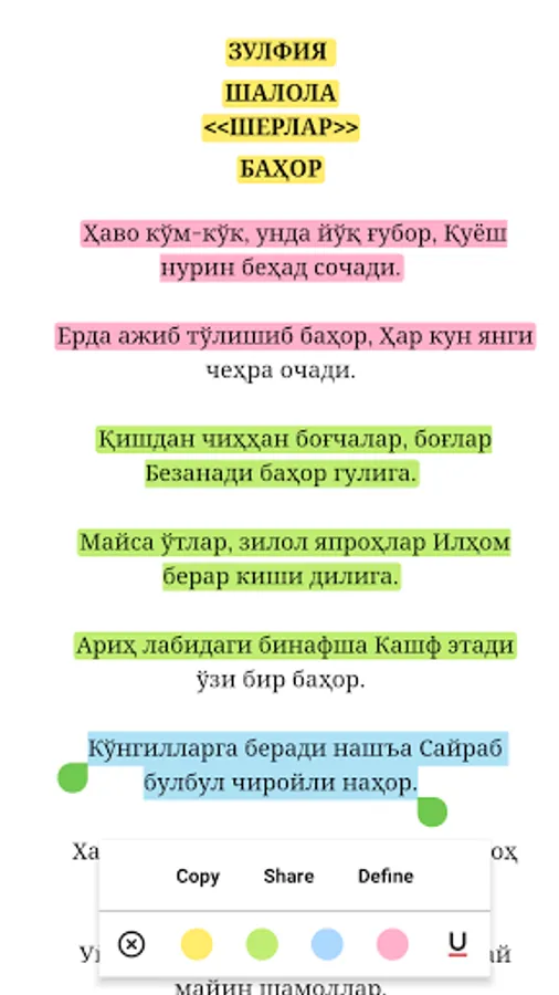 O‘zbek xalqining sevimli shoirasi, taniqli jamoat arbobi Zulfiya Isroilova Shoira xotin-qizlar bilim yurtida o‘qigan vaqtlaridayoq adabiy to‘garaklarda she'rlar mashq qila boshladi. O‘zbekiston Fanlar akademiyasining Til va adabiyot instituti aspiranturasida tahsil oldi. So‘ngra Bolalar nashriyotida muharrir, O‘zbekiston Dav-lat nashriyotida bo‘lim boshlig‘i, yillarda esa «O‘zbekiston xotin-qizlari» («Saodat») jurnalida bo‘lim boshlig‘i. Ushbu shoira o'zining sherlari bilan ko'p qizlarimizning qalbidan joy olgan. Zulfiyaxonimning "Shalola" nomli sherlar kitobini sizlarga tafsiya qilamiz.