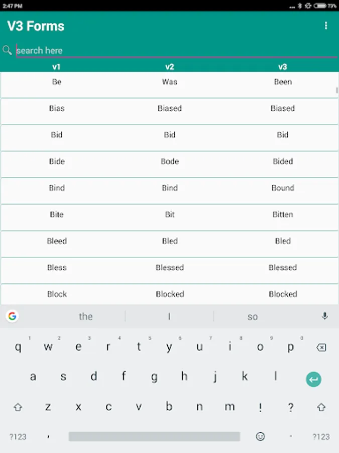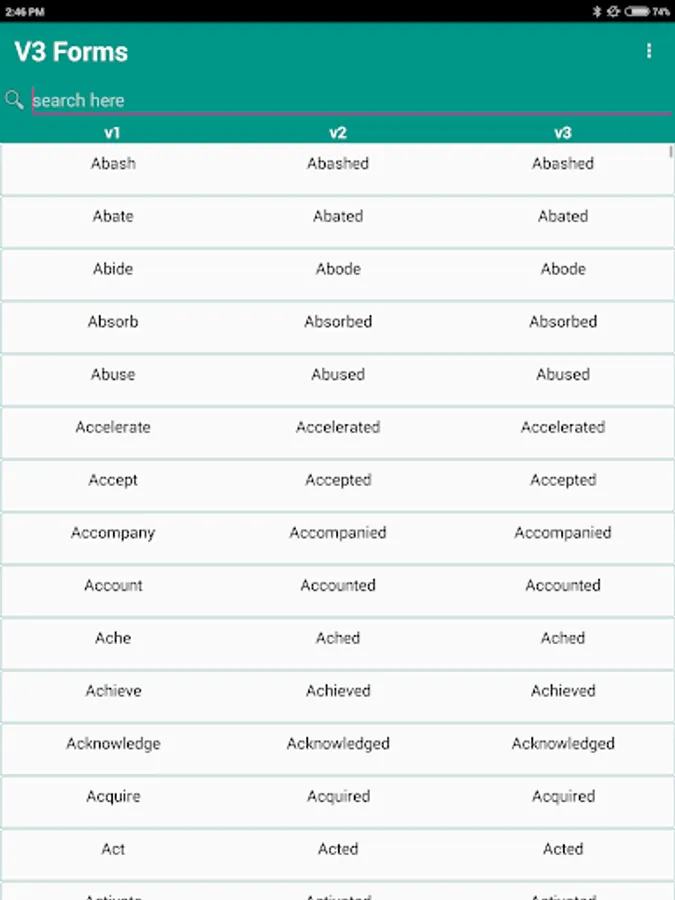 V3 Forms short for "Three Forms of Verbs" in English brings hundreds of English verbs to you.
