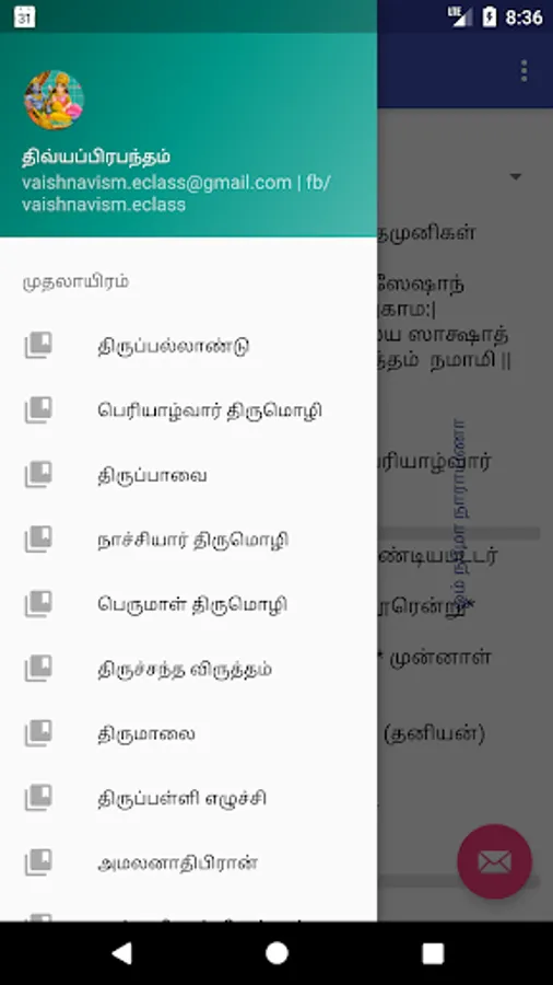 2. You have an ability to read through the paasurams by Prabandam. In order to use this feature, click on the Navigation Draw(see on top left 3 horizontal lines).
