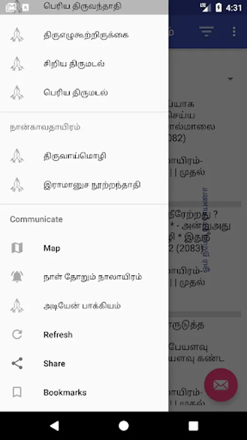 7. Share the paasuram to your near and dear, to share keep the paasuram on the top and select "Share" from Navigation Draw. This will open options to share, choose the mode you want to perform share.