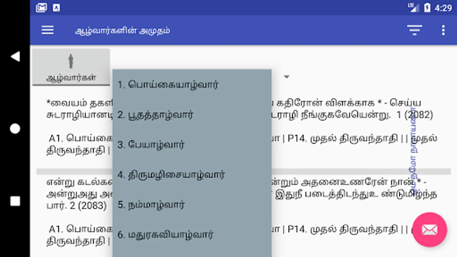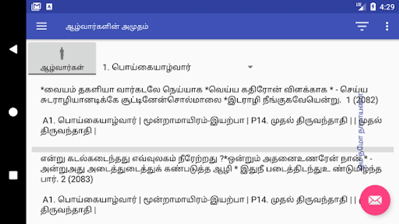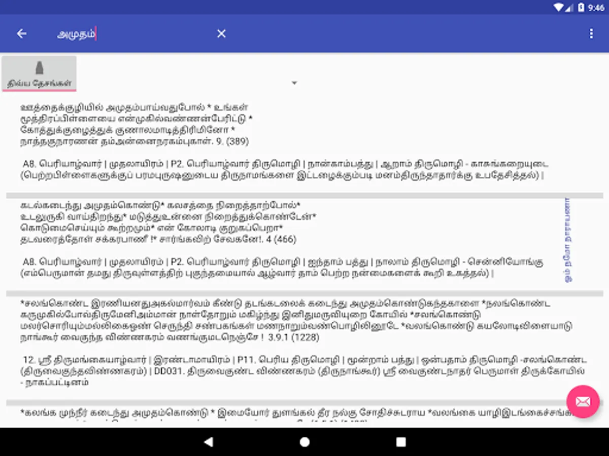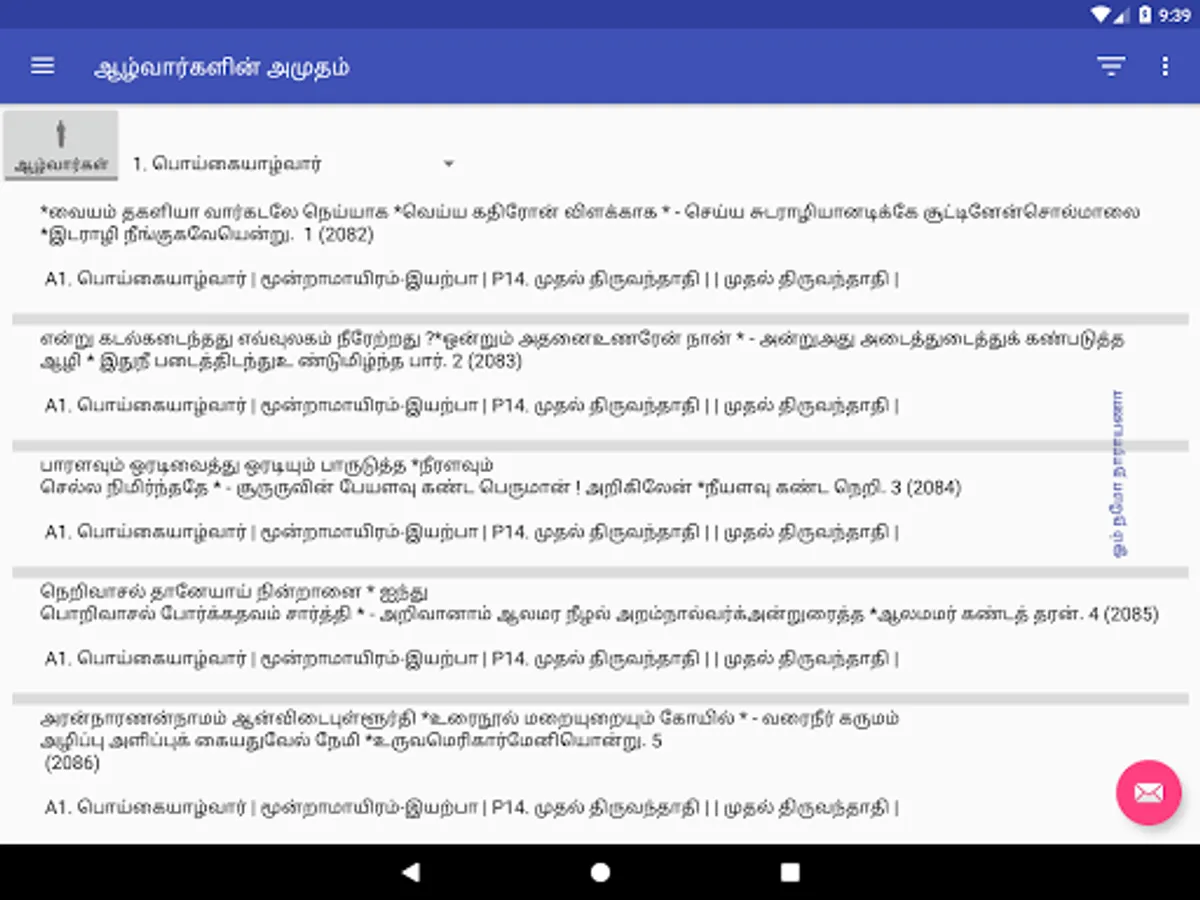 5. Filter selected paasurams by clicking on the "Filter" icon on the blue bar. Type the word to filter. Use Tamil keyboard like Google Indic Keyboard(https://goo.gl/eGYEcb) or Google gBoard (https://goo.gl/DBpsug)