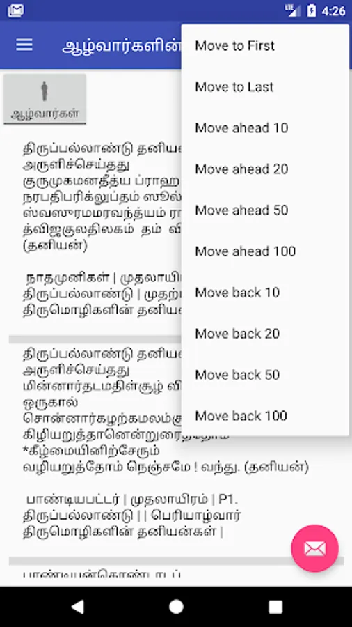 8. Navigating through vast list of paasuram can be challenging, here is an easy way to Navigate, select Options Menu (top right corner 3 dots) and choose "Filter" type either pasuram number, azhwaar, divyadesam, prabandam, or any word. Alternately, you can choose to jump by 10,20,50,100 both forward and backward. Goto first or last paasuram with ease.