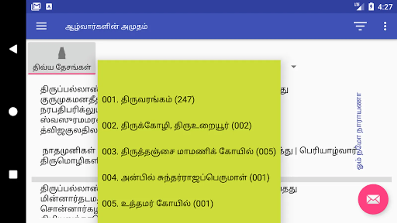 3. View Pasurams by Divyadesam, from the main window click on the button named "Azhwaargal" once to toggle to "Divyadesam", select the Divyadesam from the list next to the button. In case the contents are refreshed, goto Navigation drawer and select option "Refresh", and try again.