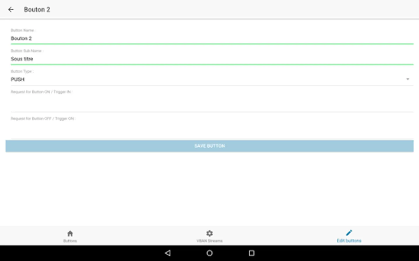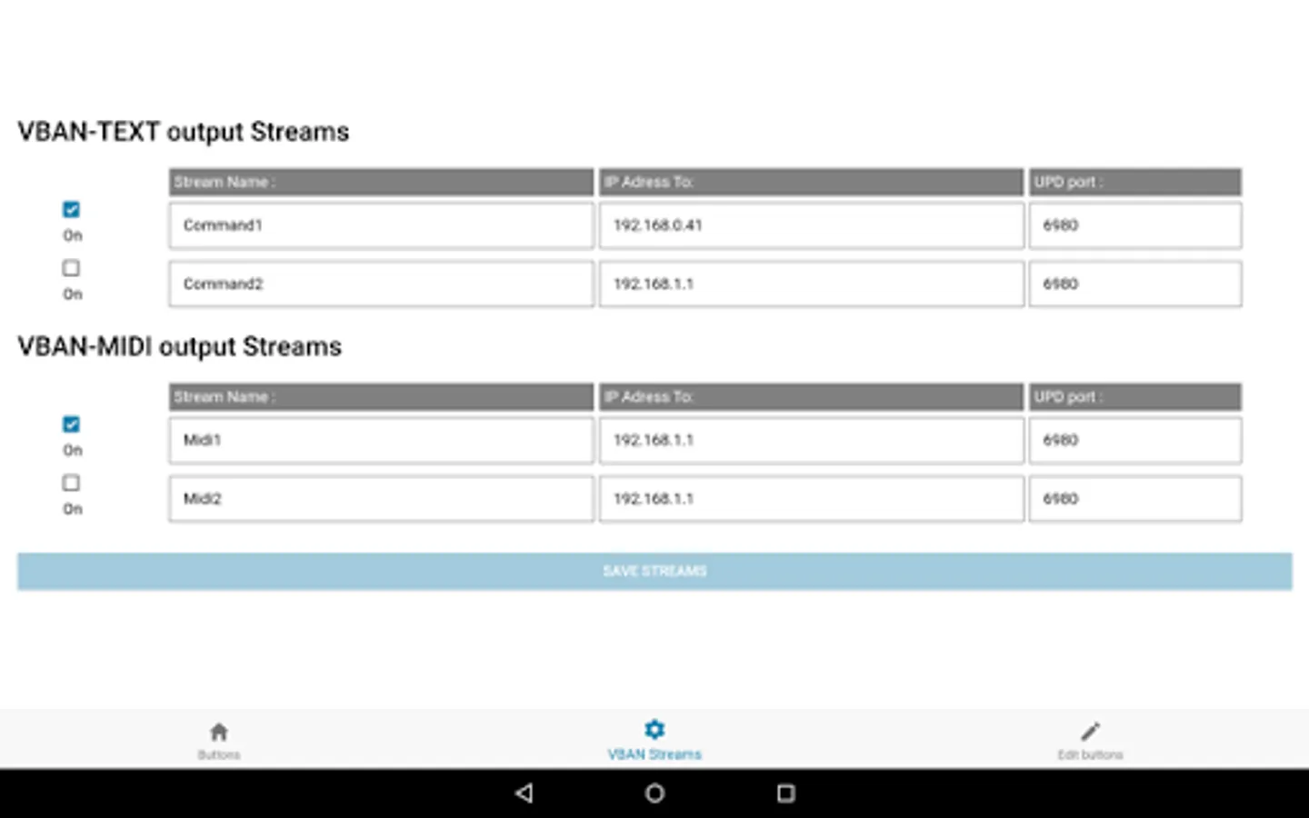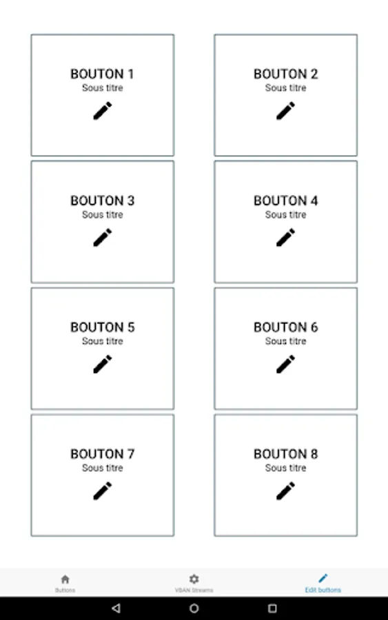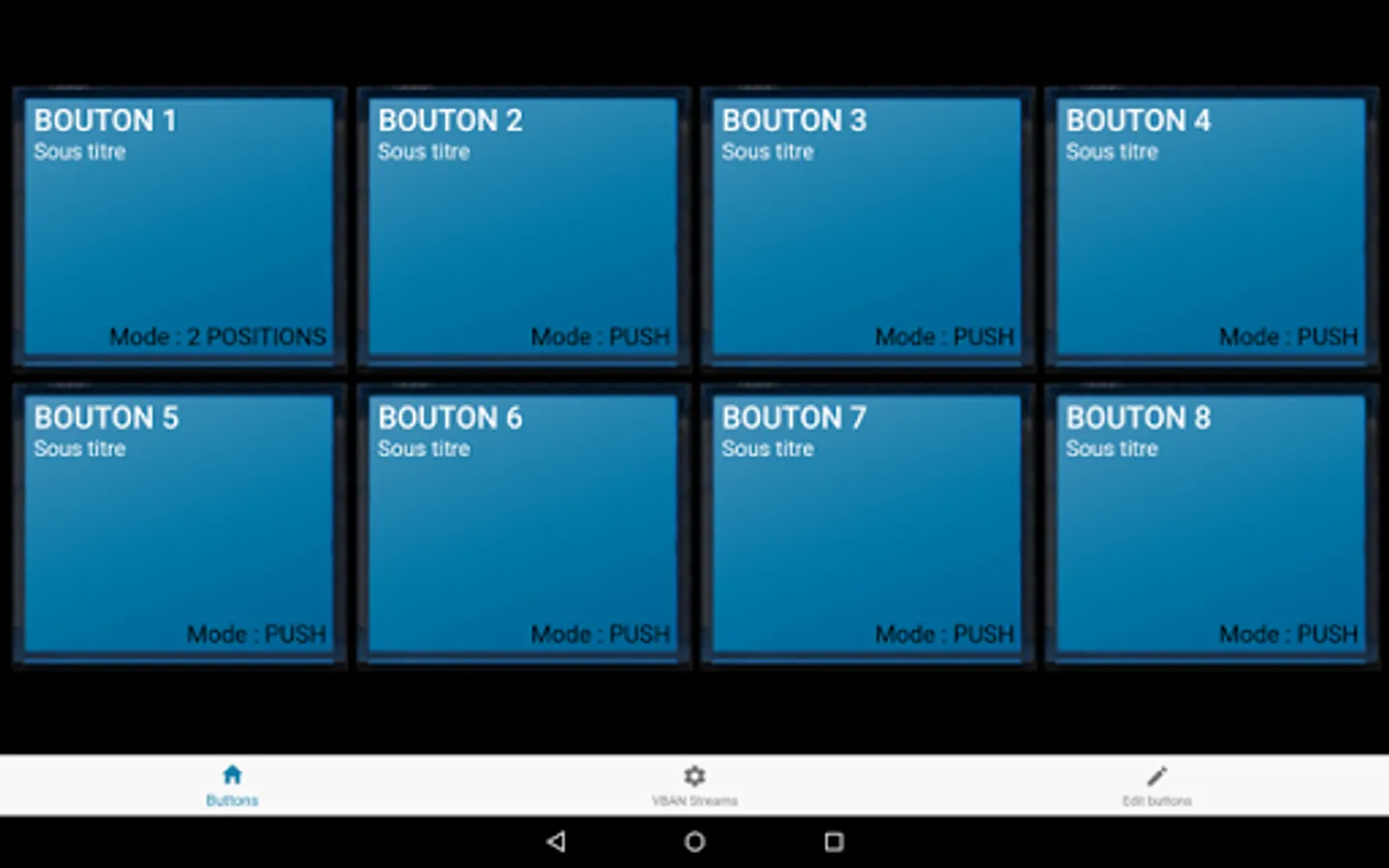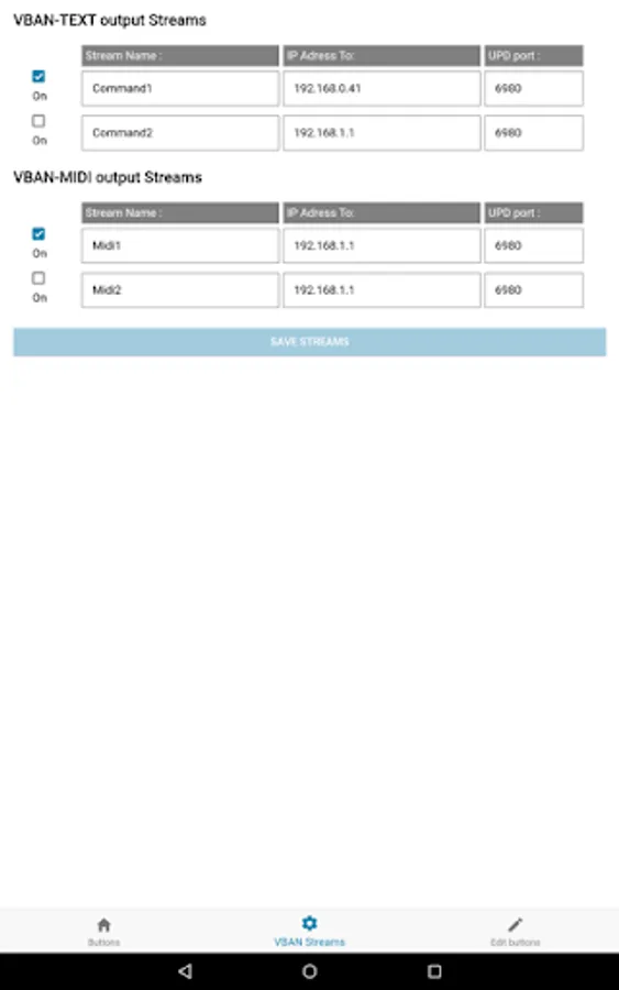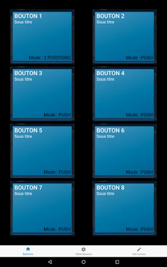 Each buttons can have a Color, Title, Subtitle and two scripts (ON & OFF) to send TEXT or MIDI Command through two VBAN stream (2 different IP address of your network).
