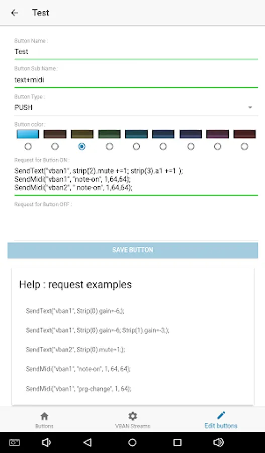 VBAN Buttons will let you enter a Script to send VBAN -TEXT or VBAN-MIDI Request when the buttons is pushed or/and released (PUSH or 2 POSITION mode).
