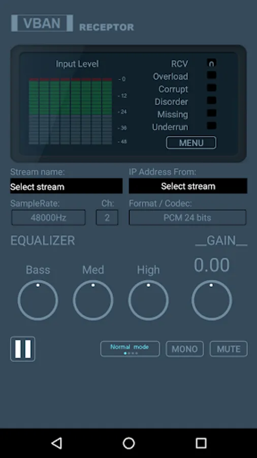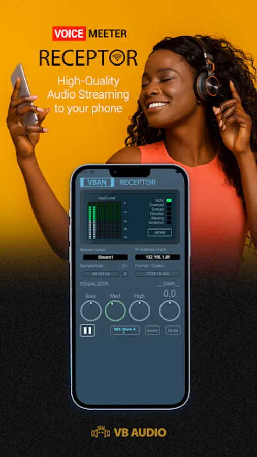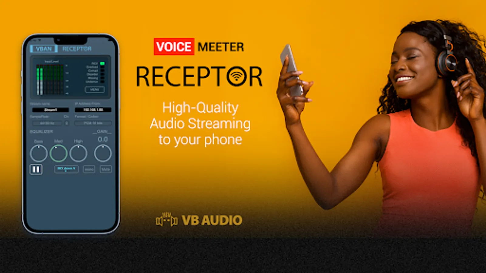 VB-AUDIO Software / VBAN-Receptor allows listening to any VBAN Streams in any audio formats (1 to 8 channels) and transform your mobile device in High Quality Wireless Headphone. The integrated 3 bands vintage EQ and Analog Gain Control will give you a unique audio experience.