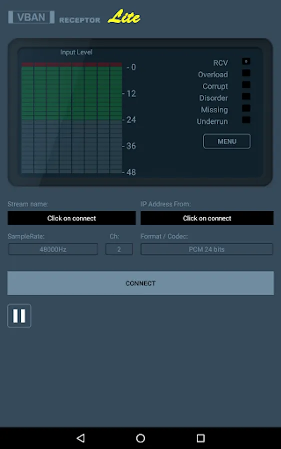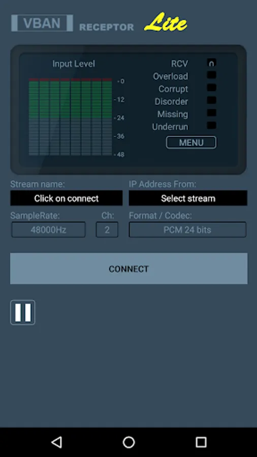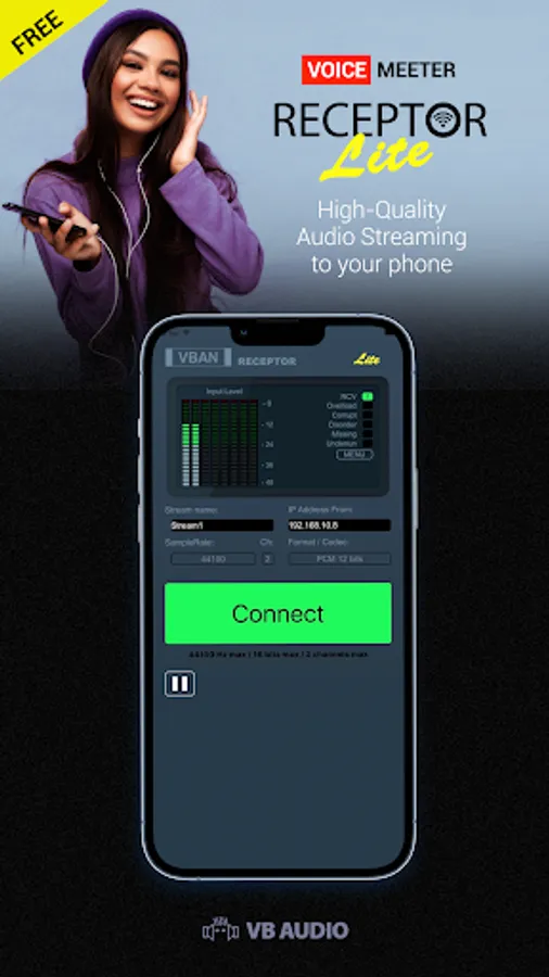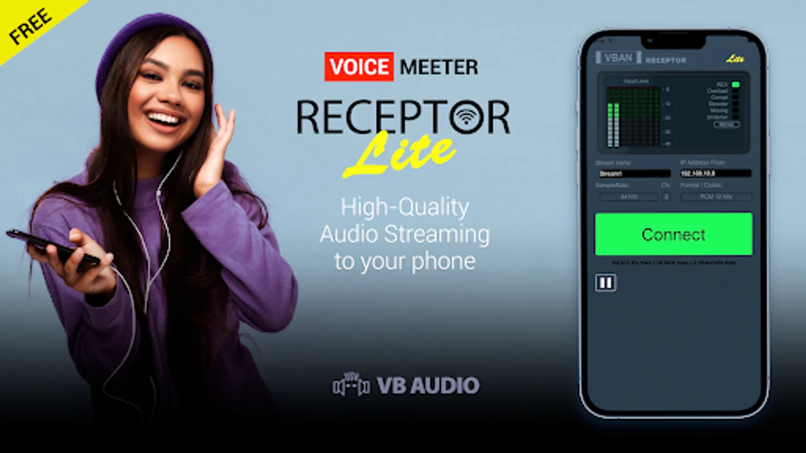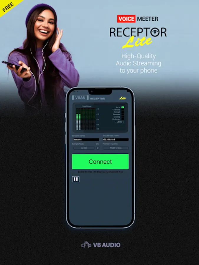 VB-AUDIO Software / VBAN-Receptor Lite allows listening to VBAN "Stream1" in CD Quality Format (44.1 kHz, 16 bits Stereo max) and transform your mobile device in High Quality Wireless Headphone.