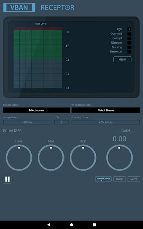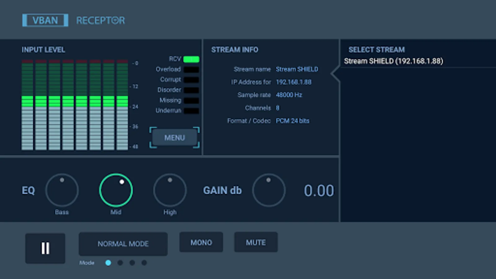 VB-AUDIO Software / VBAN-Receptor allows listening to any VBAN Streams in any audio formats (1 to 8 channels). The integrated 3 bands vintage EQ and Analog Gain Control will give you a unique audio experience on your video audio setup.