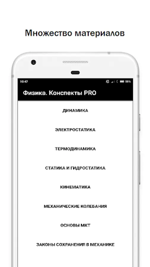 This application contains detailed notes, diagrams, formulas and the like in many fields of physics. These materials will help both in their studies and in preparing for exams, and standings.
