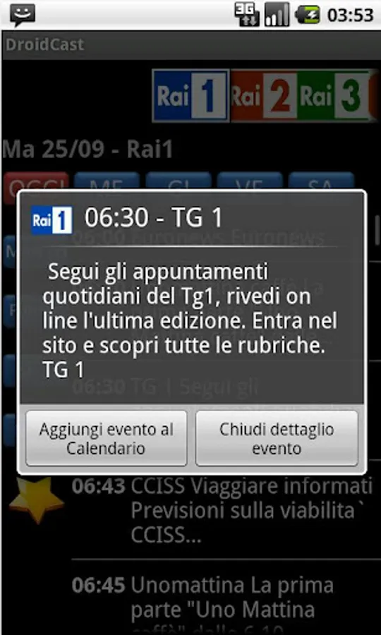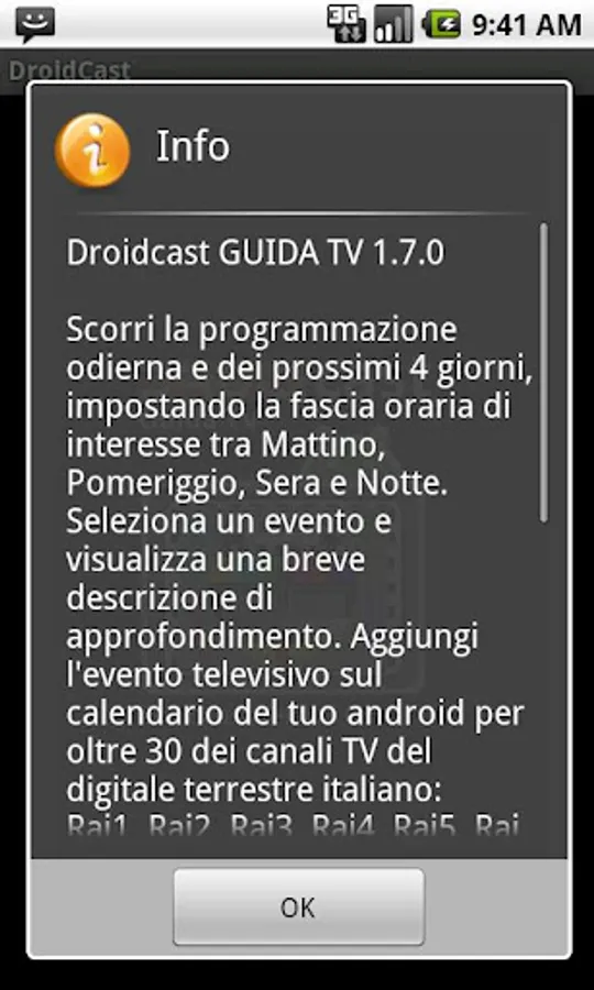 TV Guide Droidcast, see the programming today and the next 4 days, setting the time zone of interest including Morning, Afternoon, Evening and Night. Create and reorder your customized list of favorite channels. Select an event and displays a brief description of the study. Add the television event on the calendar of your Android with more than 35 channels of digital terrestrial TV Italian.
