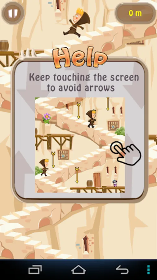 But Teo was very clever. He found a way to escape. Now your mission is to control Teo to escape from the Evil Mountain. Just touch on screen to run slowly or release your finger to make him run faster. And don't forget to avoid the arrows.