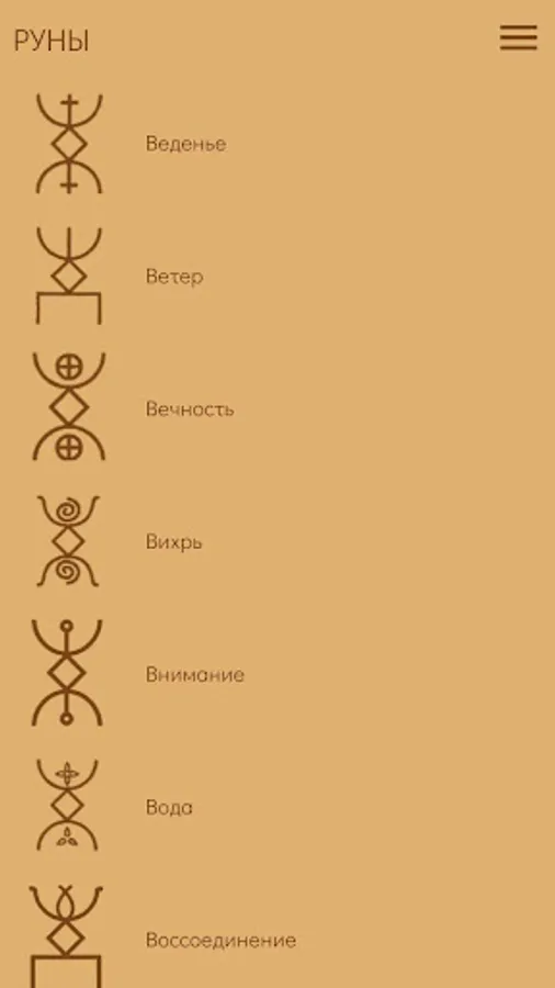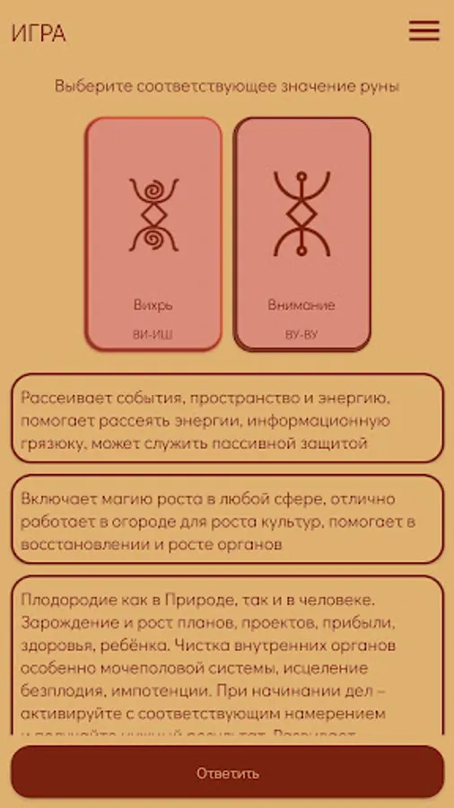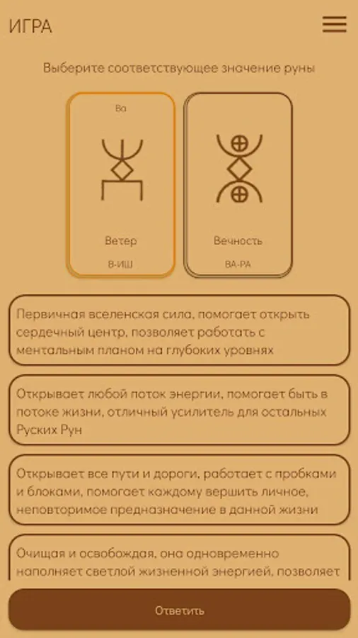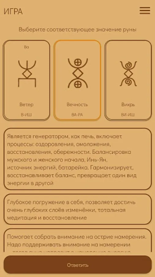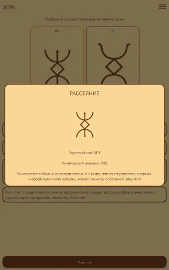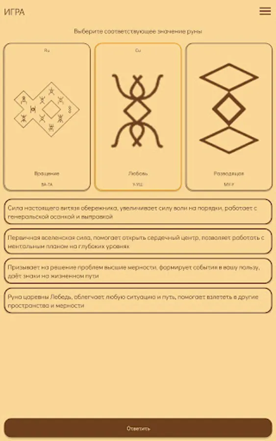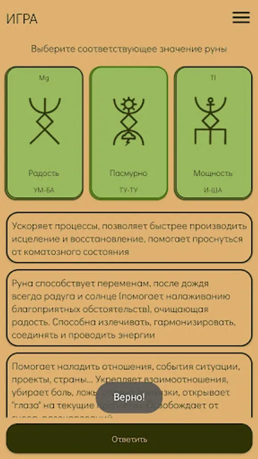 In the application, you will be offered Runes all at once with a list with values and related information (Runes section). And also one rune directly to guess the value. From the very beginning, two Runes were given on the screen: the main one, the value that you need to guess, remember and the next (which you will be offered for the main one). If "guessing" has already begun, then there are three Runes on the screen. The central one is the one you guess and the other two, on the left - already guessed, on the right - which you have to guess. In the answer options, only one is true. If you have not guessed, then it will be proposed to find the right answer until it is called. In the settings you can set the free order of the Runes or without it. In the latter case, the runes during the game may be repeated.