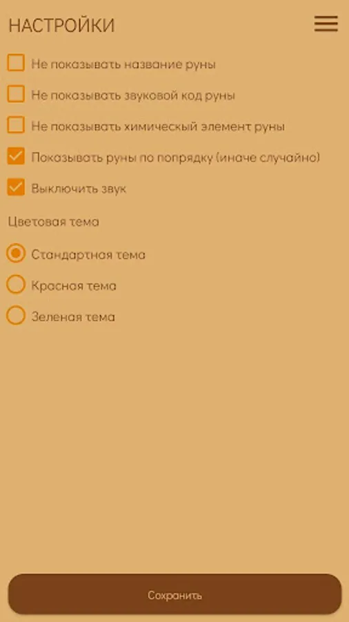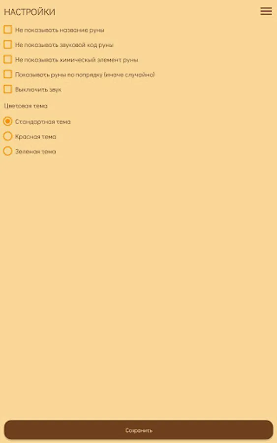 In addition, in the settings it is possible to remove the chemical element designation for the corresponding Rune, the name and sound code of the Rune (or leave it) to complicate the game, as well as change the color scheme of the application.