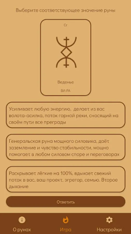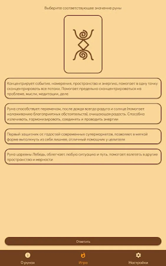 The game has 41 runes. You will be presented with the Rune and several answer options, of which only one is correct (corresponds to the action of the Rune). In the settings you can set the free order of the Runes or without such an order. In the latter case, the Runes during the game may be repeated.