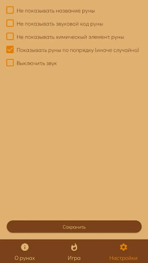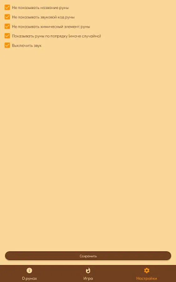 In addition, in the settings it is possible to remove the designation of the chemical element for the corresponding Rune, the name and sound code of the Rune (or leave) to complicate the game.