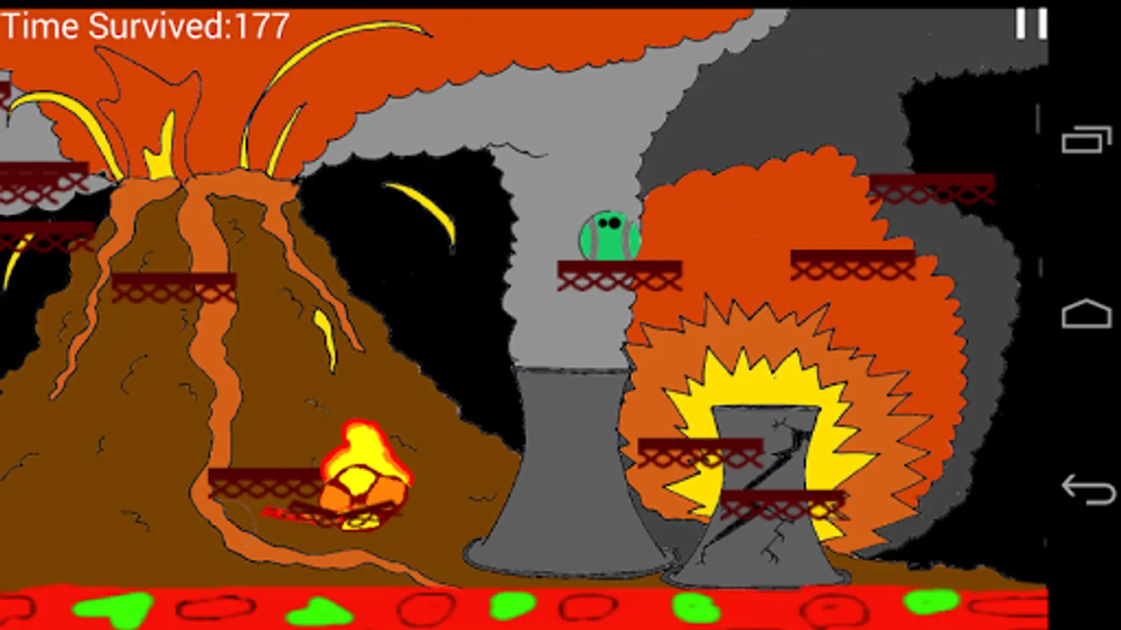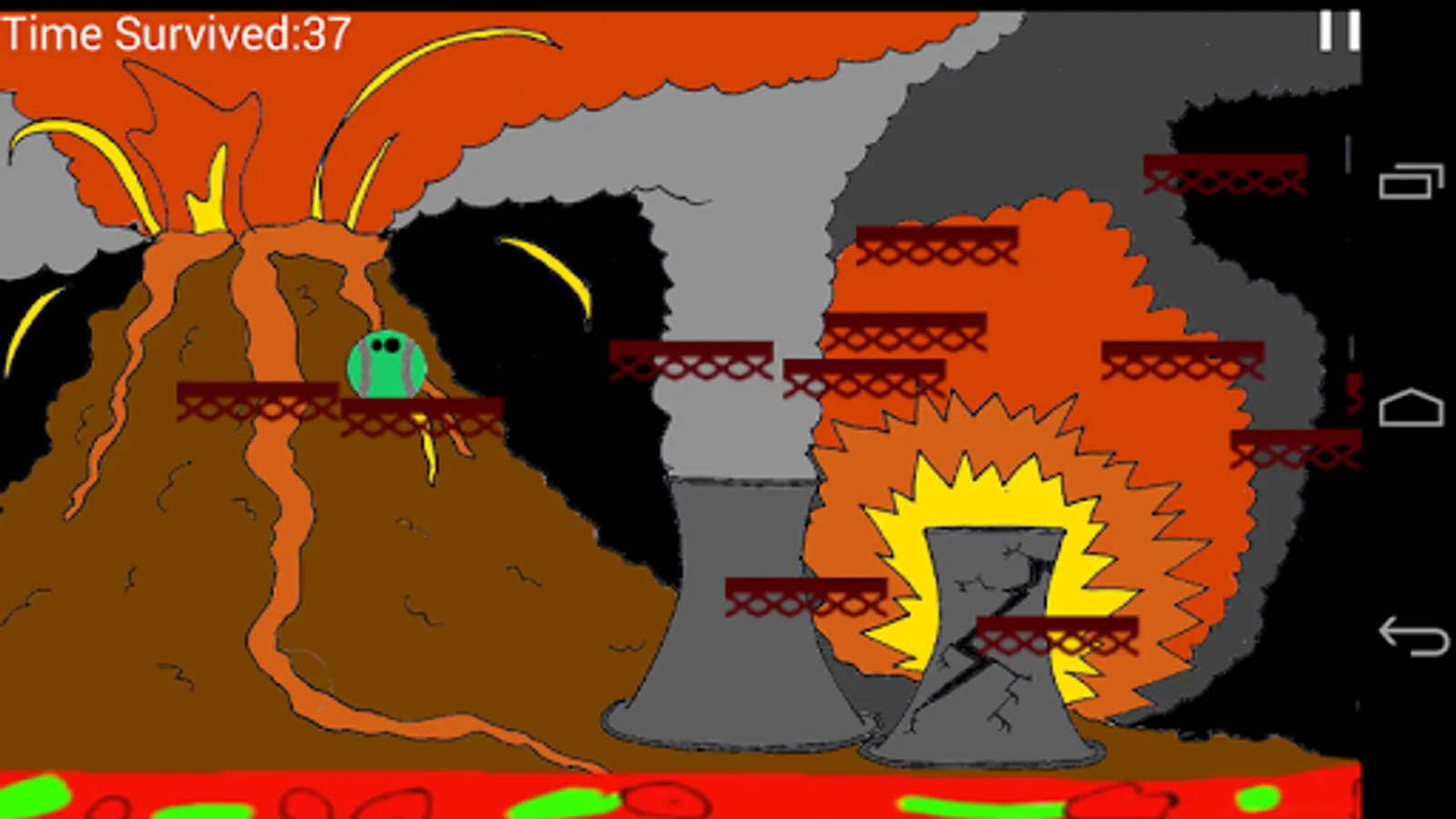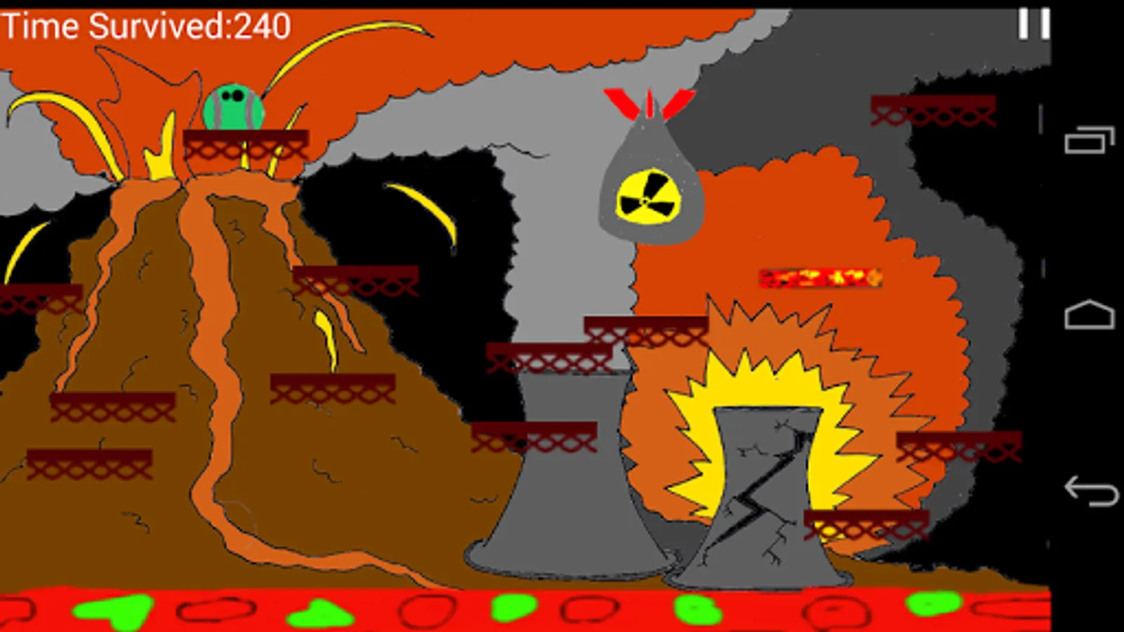 You are a tennis ball abandoned next to a nuclear power plant. Suddenly, the ground shakes - cracks appear, lava bursts out of the ground and a volcano is born. The nuclear power plant explodes and radioactive debris is thrown out violently. You begin to feel a stirring inside of you and suddenly you can move and jump, but the lava is coming closer - so quickly jump onto the platforms that are thrown out by the power plant and avoid meteors and micro-nukes and don't fall into the Nuclear Inferno.