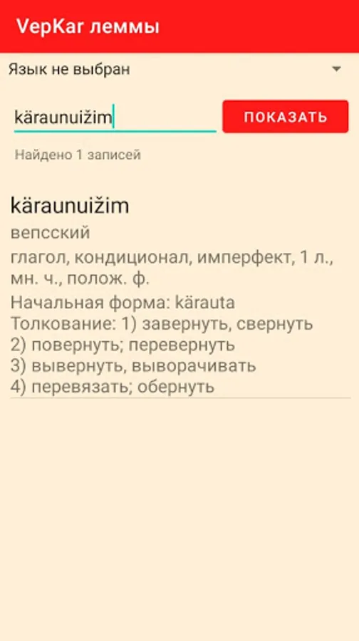 For word forms, the initial word form is indicated. For example, for the Vepsian verb "käraunuižim" the infinitive "kärauta" is the initial form.