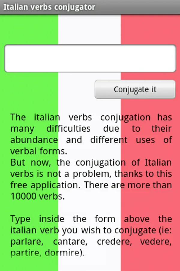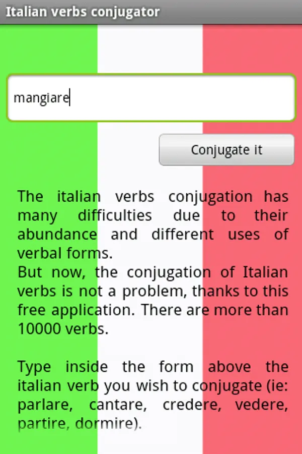 But now, the conjugation of Italian verbs is not a problem, thanks to this free application. There are more than 10000 verbs.