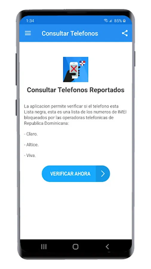 The application allows you to check if the phone is black list, this is a list of blocked IMEI numbers generated by the telephone operators Dominican Republic: - CLARO. - Altice. - LIVE.