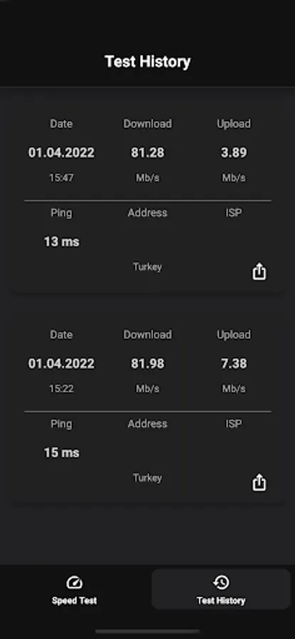 You can test your internet download and upload speeds, learn your internet service provider and ip information. You can also share your tests with your friends and compare them.