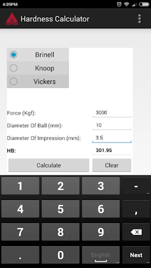 for example - Enter - load, Indenter ball diameter & impression measurement diameter, it will calculate the Brinell Hardness.