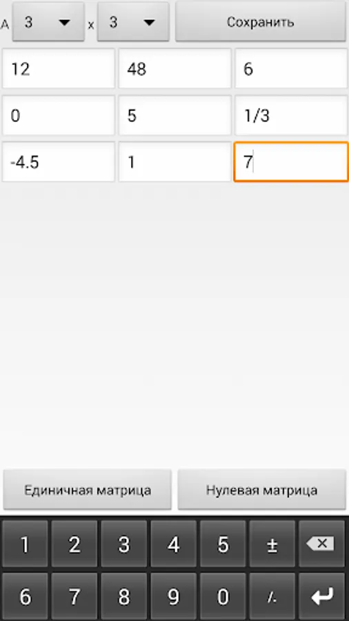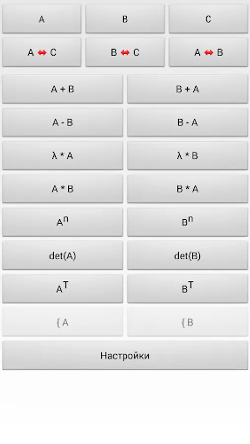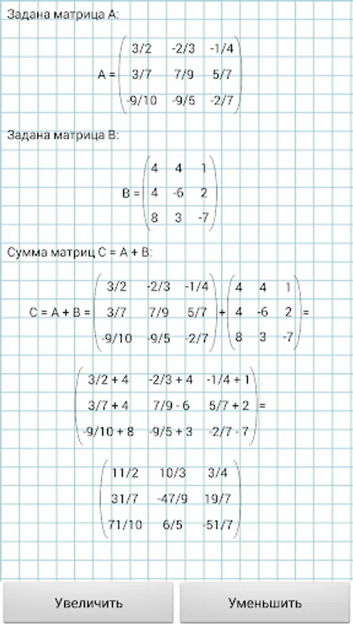 The program to perform actions on matrices. Shows the calculation process step by step.