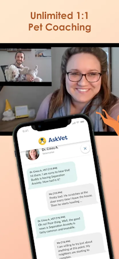 - 1:1 pet health and wellness support for nutrition, healthy habits, behavior, training, preventative care, and more.