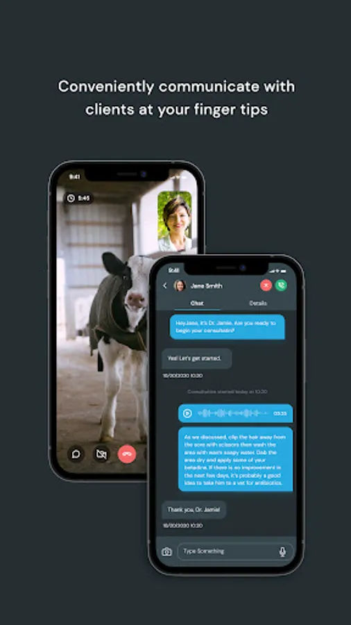The smartphone camera lets the veterinarian and the animal owner see and talk to each other. The rear camera switch on the app lets the owner show the veterinarian the animal and its environment. A visible timer counts down the 15 minutes and then cuts the tele-videoconferencing session. After the session the veterinarian can send a text message via the app to provide follow up information to the animal owner.