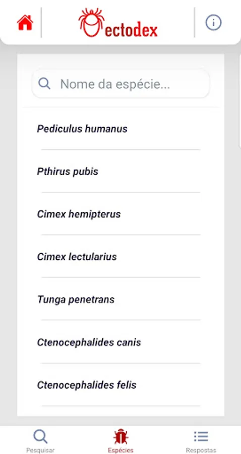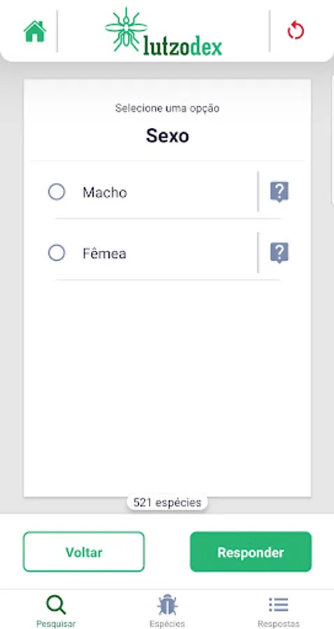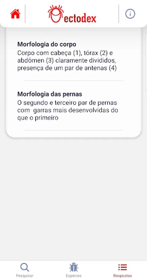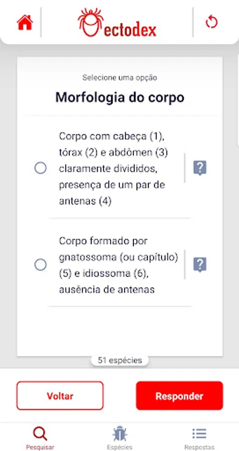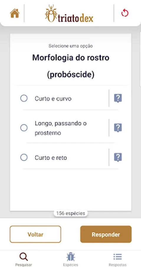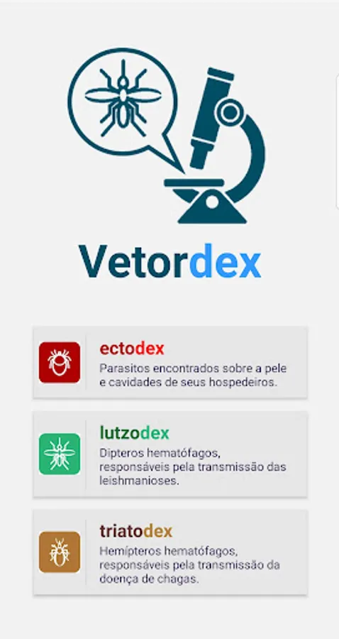 With VetorDex, the morphological identification of sand flies (Diptera: Phlebotominae), Triatomines (Hemiptera: Reduviidae) and ectoparasites (Insecta: Phthiraptera; Hemiptera; Siphonaptera and Arachnida: Ixodida) became easier. This app breaks away from traditional dichotomies and features up to eight options for answers to a question. There are images that help to observe structures for all stages. In each question, the number of possible species is presented. At any time, you can access the answered questions and correct the steps if necessary. In the list of possible species, information about the descriptors, geographic distribution and medical importance of the species can be accessed.
