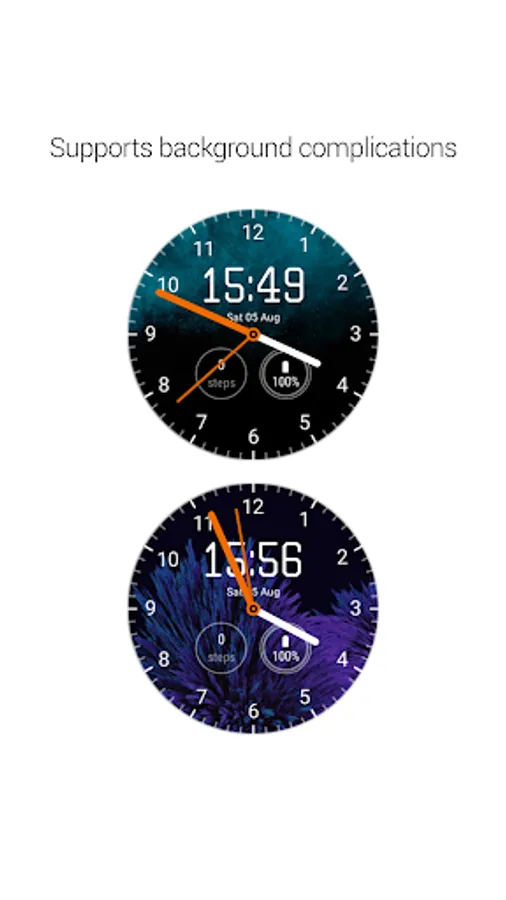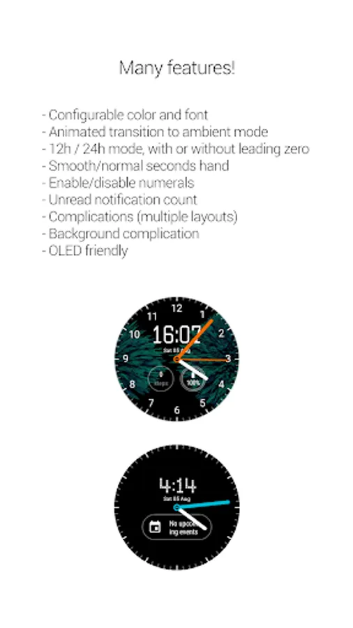 Note 4: Android Wear 2.0 is required for complications. The watchface will work on Android Wear 1.6 but will not show any data inside the complications!