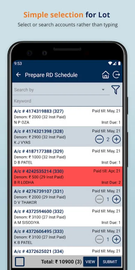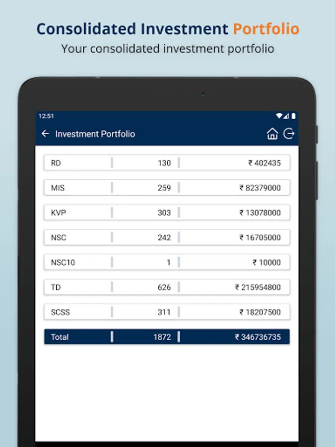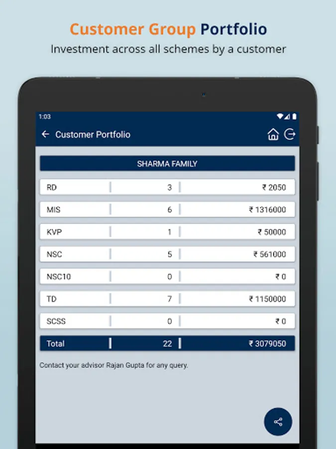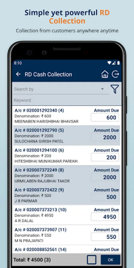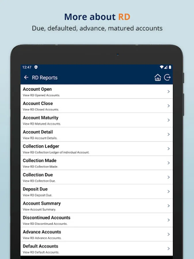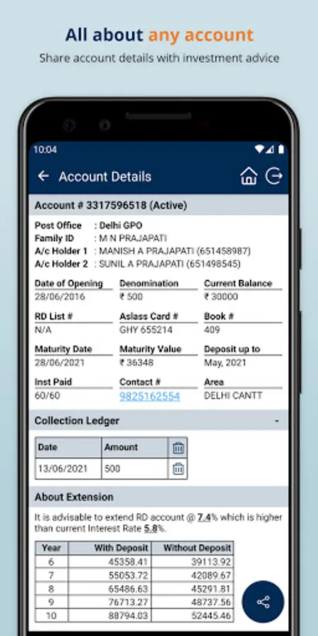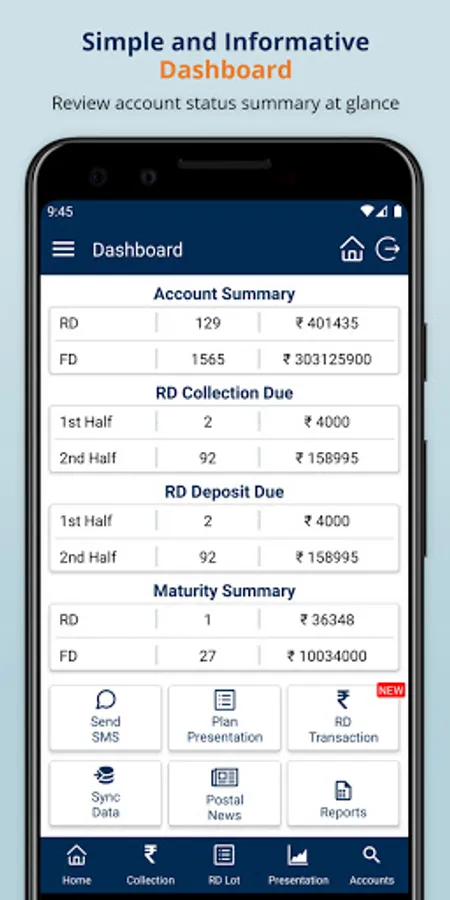 ✓ Dashboard: View complete portfolio overview with easy to understand and powerful dashboard with account summary, maturity summary, collection due and deposit due. You can view 1st half and 2nd half summary for RD accounts.
