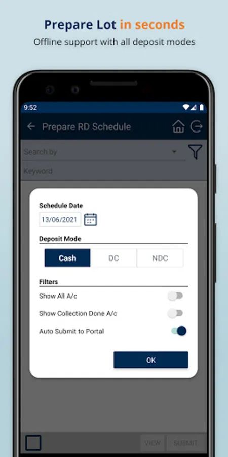 ✓ Make RD Collection: Maintain all RD collections in single tap which eliminates the need to maintain collection diary or registers to maintain collections. You can collect any amount which can be daily/weekly/monthly/advance. There is also an option to send SMS to your client for Cash Collection receipt.
