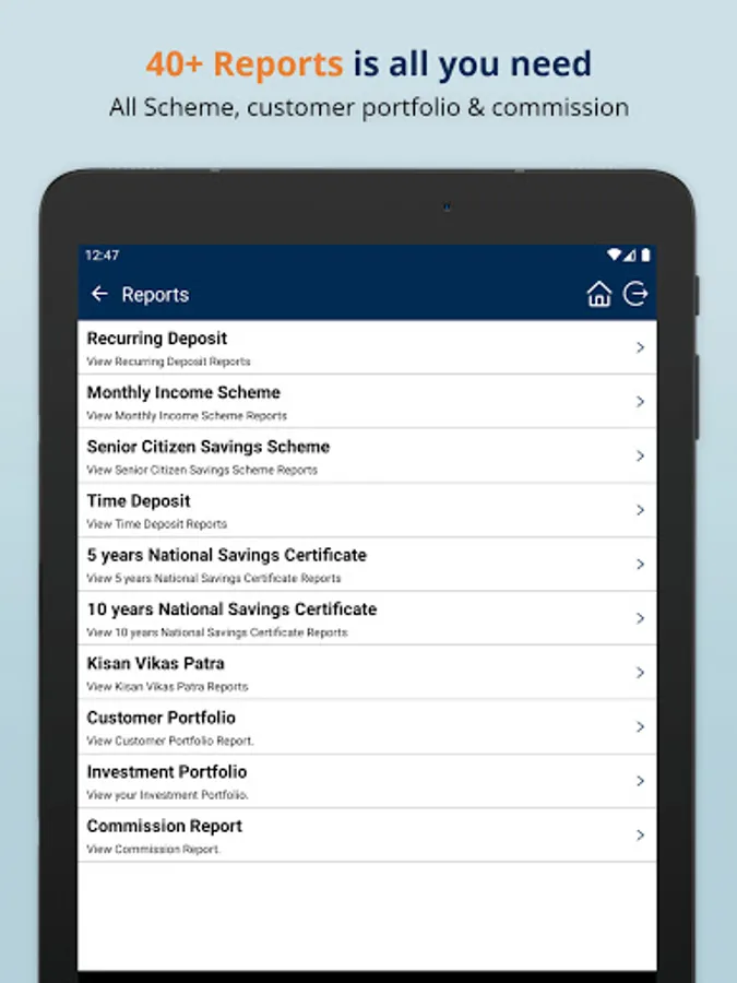 ✓ 40+ Reports: Presenting 40+ reports including Account open, maturity, collection ledger, customer portfolio, investment portfolio, commission/TDS reports and many more which helps dop agent to keep track of all accounts and customer portfolio with a single tap on mobile.