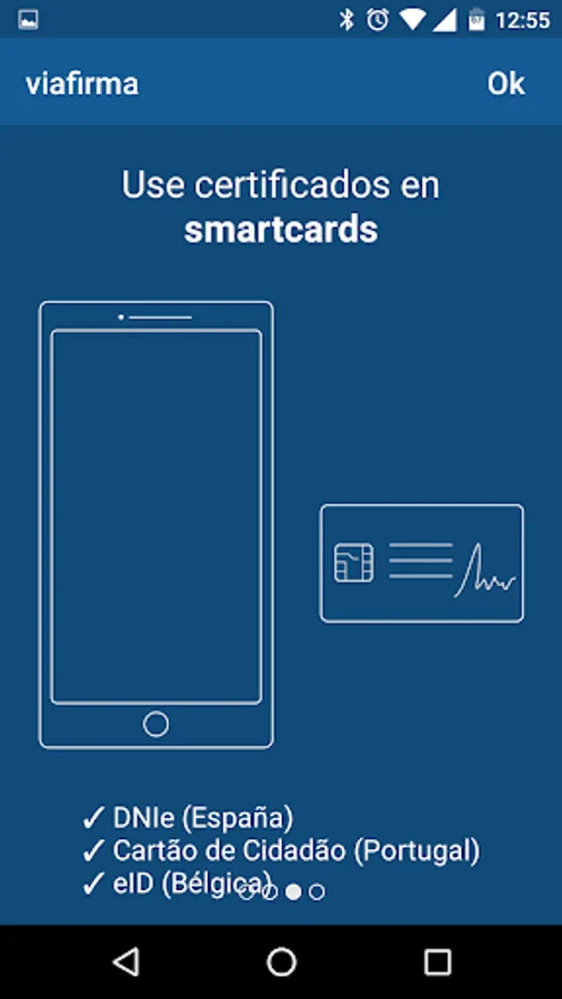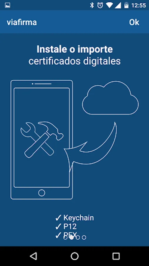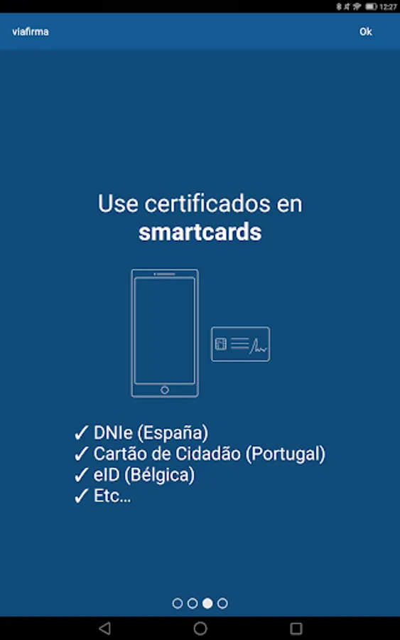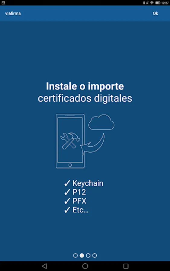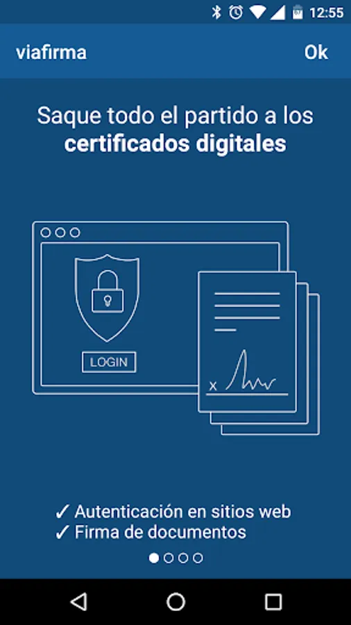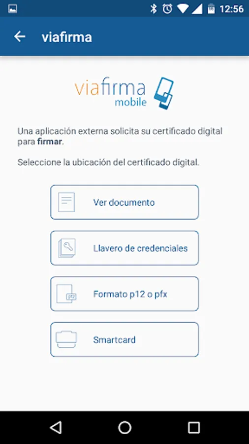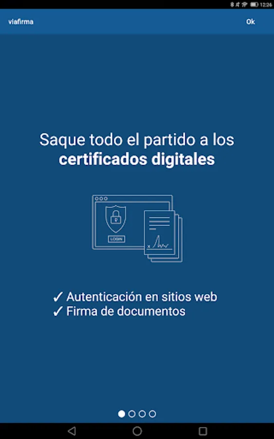 That mobile client allows using your previously installed digital certificates on your device, in order to perform secure authentication and advanced digital signature in web and mobile applications integrated with Viafirma Platform.