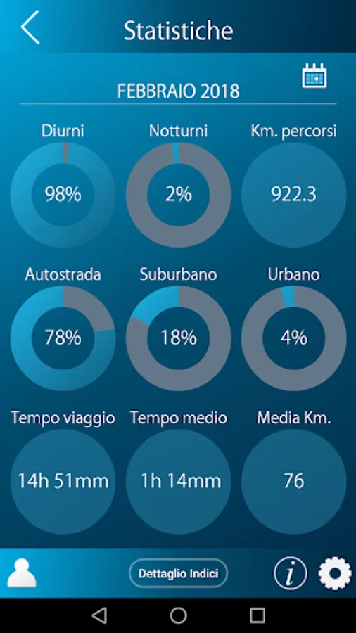 Statistics: to see, month by month, the kilometers traveled, the statistics of use of the vehicle and, in graphic form, the risk rating Viasat (IRV).