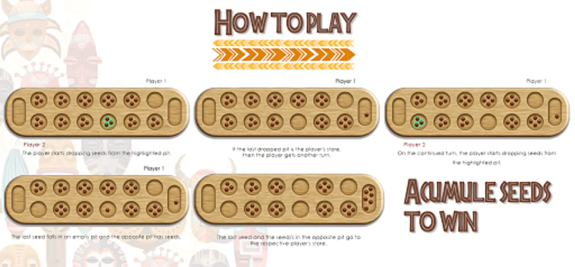 2) Each player controls six houses and their respective seeds. Your score is the number of seeds you store in your warehouse.