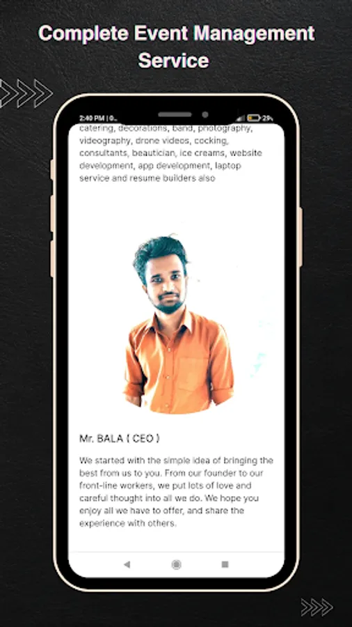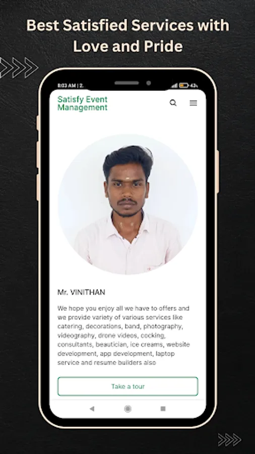 Hi, The Satisfy Event Management Service Application is Used for Booking Orders , Event Planning and Knowing Our Service Journey also. This app helps you to Book or Order your esteemed work. We are Providing Catering service, Makeup artist ( Beautician ), Decoration ideas, Decorations, Photography Service, Videographer, Cooking, Chief and Labours and More. Install the app for More details.