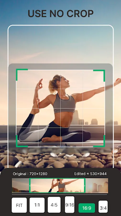 No crop video : Watch videos in full screen without cropping. Use the video's full size and make it fit without cropping.The feature offers predefined and custom aspect ratios.