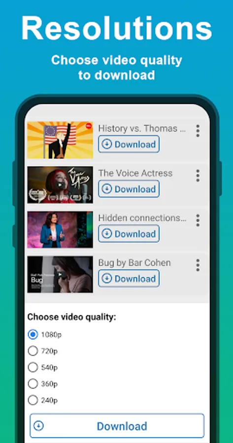 Browse, search, find any videos of favorite social influencers, game bloggers, celebrities, stars you like, or paste any video URL link and simply tap Download! Choose the best video quality available and file size for your phone or tablet device storage space!