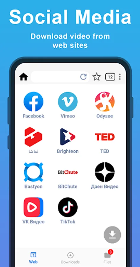 Video Downloader to save Facebook, Instagram, Vimeo, Odysee, Bastyon, Brighteon, BitChute, Dzen, VK, Snapchat, Tamasha, Discord, TED, Twitter, Telegram, TikTok videos in MP4 1080p Full HD, 4K file format from all top social networks and video tubes! Free, fast, safe, private all in one HD Video Downloader and multimedia file saver helps to download TikTok, Instagram, Snapchat, Telegram, Twitter, Facebook videos with fastest download speed and security of files — one of the best video downloaders for Android phone or tablet to play and watch video offline.