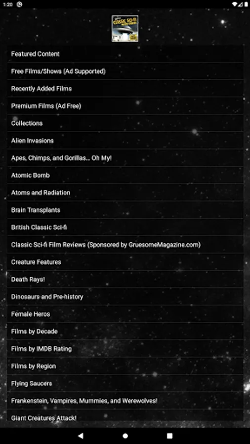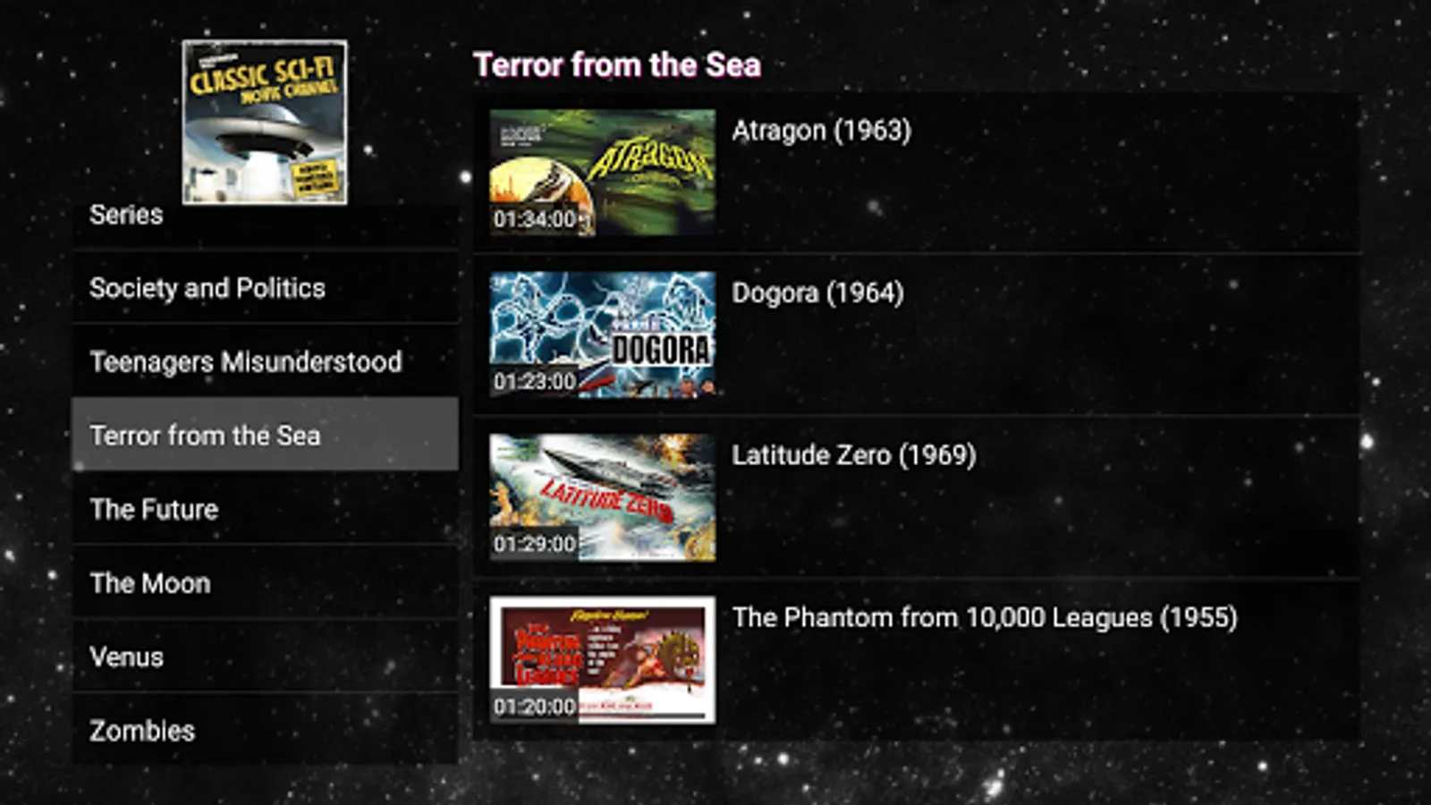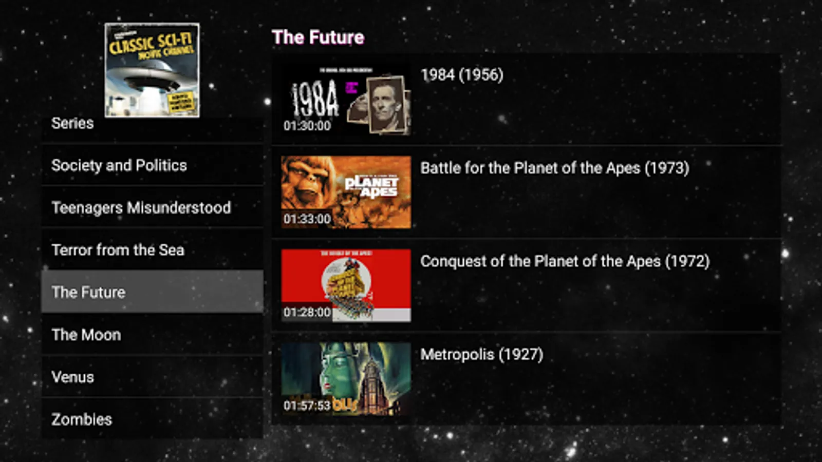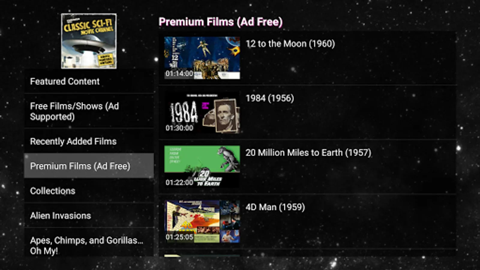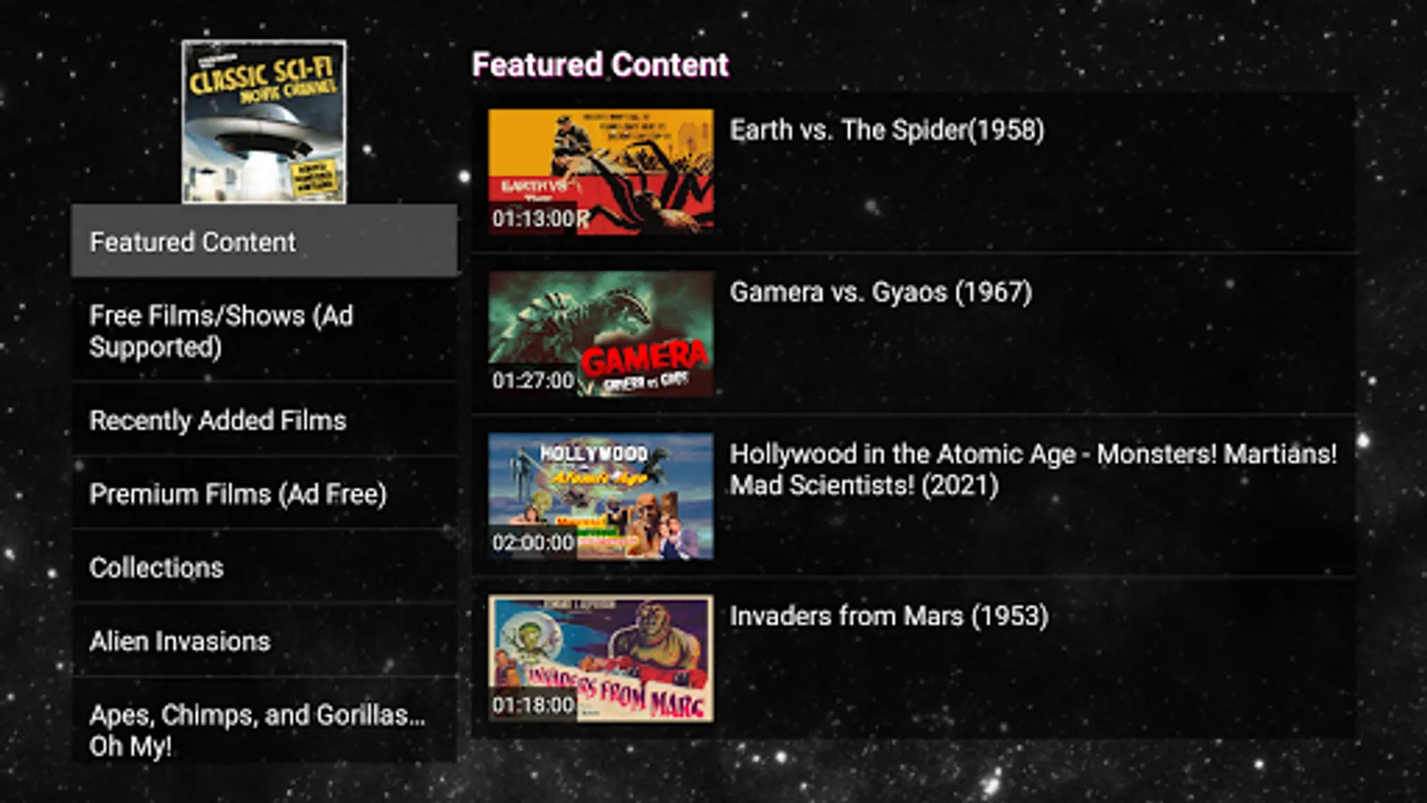 Experience the best classic science fiction films, TV shows, and serials from the 1940s, 1950s, and 1960s. Our vast library was curated by dedicated sci-fi fans from the vaults of film history. Experience flying saucers, aliens, giant mutated insects, outer space, mad scientists, radiation, killer robots, Godzilla, Gamera, and so much more, only on the Classic Sci-fi Movie Channel!