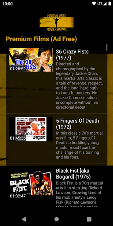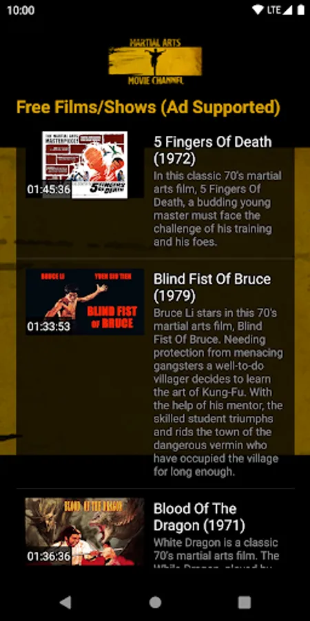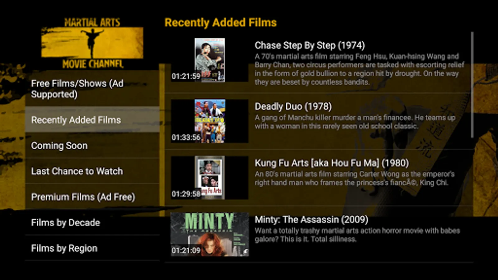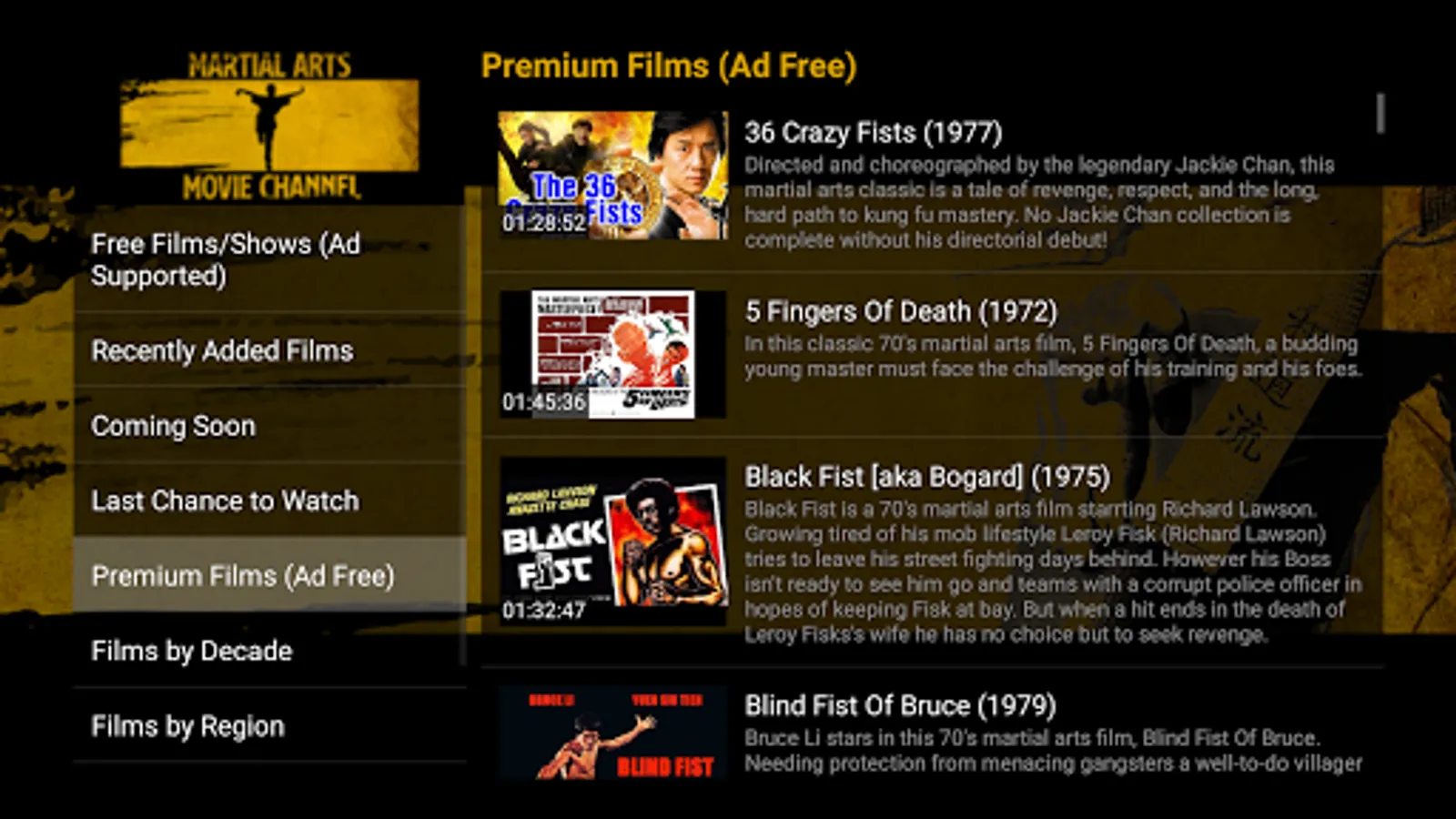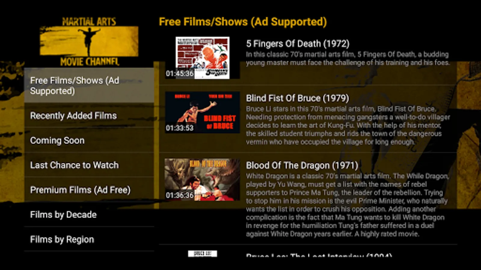 The Martial Arts and Kung-Fu Movie Channel is the Place for Free Quality Martial Arts and Kung-Fu Movies and More! With Classics Films Starring Bruce Lee Through Jackie Chan Movies and Modern Action. New Movies Are Added Every Month. We Offer Both Free Movies With Ads and Dozens OF Additional Movies With No Advertisements For Subscribers. The App is Designed Primarily For Amazon Fire Stick, but Does Also Work on Some Newer Phones/Tablets. If You Primarily Watch on Your iPhone, Phone or Tablet, Please Go To MartialArtsMovieChannel.com for 100% Compatibility On All Phones. If You Primarily Watch Movies On Your Amazon Fire TV Stick, Amazon Fire TV or New Amazon Tablet, Then This App is For You!