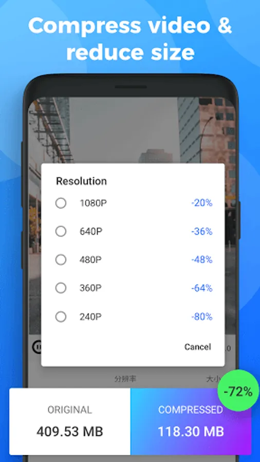 Choose resolution to compress, reduce the video file size and share to your Whatsapp friends easily.