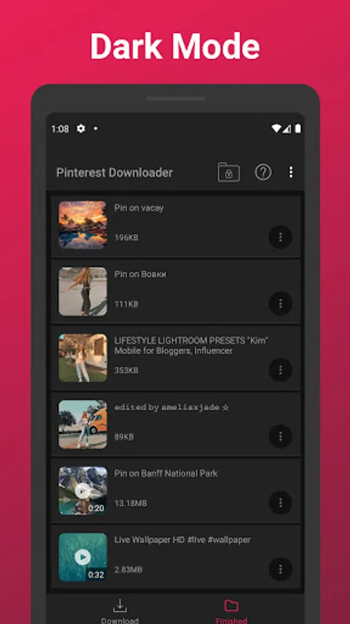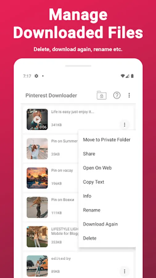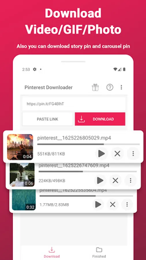 This Pinterest video downloader is totally free to use. Pinterest video download is so much fun with this powerfull downloader. You can manage your download pinterest videos, photos and gif which save from pinterest with advanced file manager. You can pause downloading mp4 and image file or cancel it. If you close the app before download file, you can continue to download video and photo on app open again. File manager for pinterest downloader. Enjoy your downloading with this download manager.
