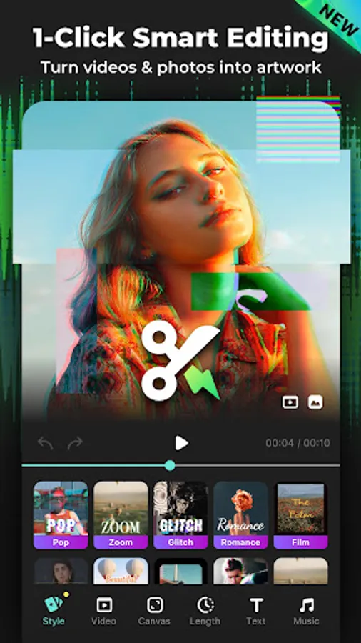 - Edit video with glitch, slow motion, freeze, neon, flash warning and more trendy effects.