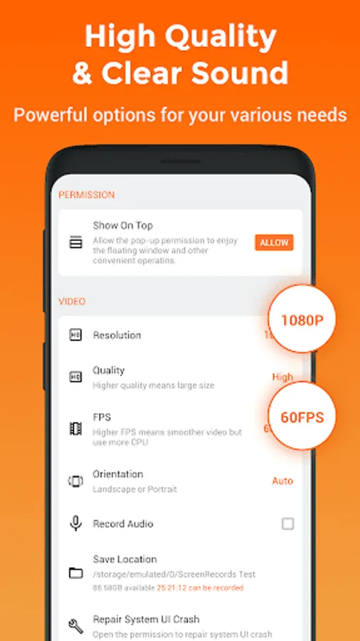 Screen Video Recorder - XRecorder supports recording game screen in the highest quality, 1080p, 12Mbps, 60FPS. Of course, you can record screen with adjustable resolution(240p to 1080p), quality, and FPS(15FPS to 60FPS).