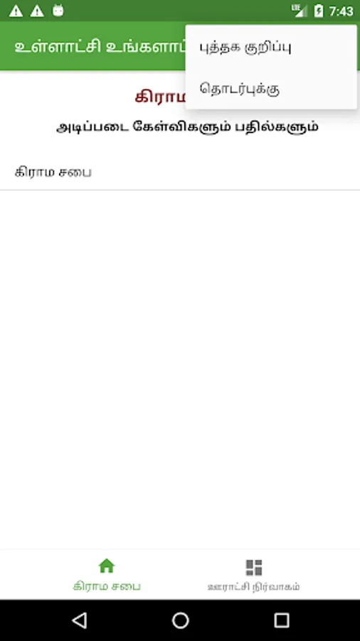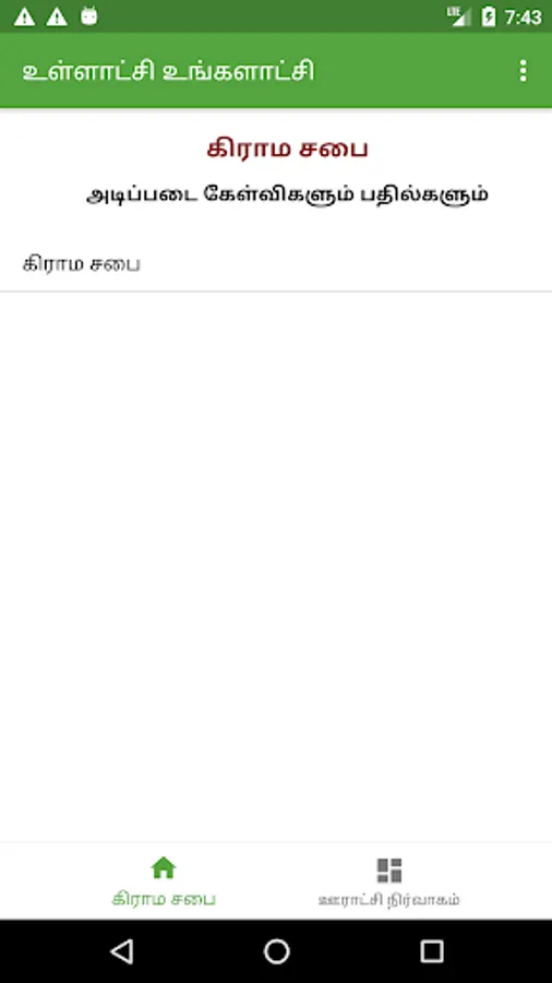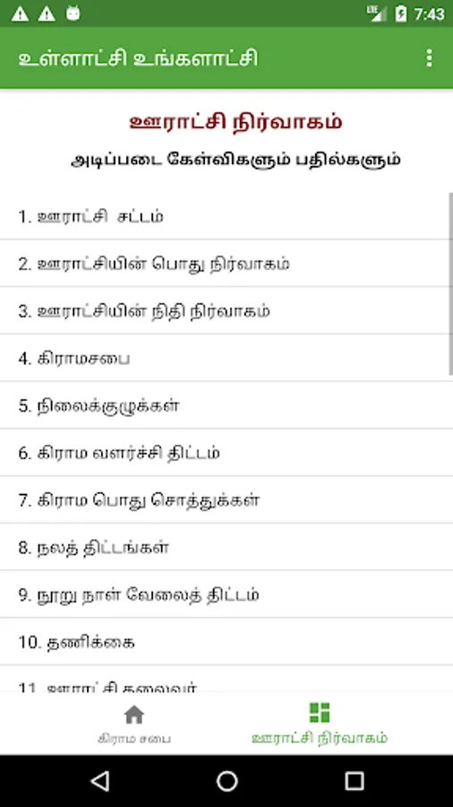 Ullatchi Ungalatchi by Vidiyal foundation, a mobile reference book, contains basic questions and answers about Graama Sabai and Ooratchi Nirvagam. The content is taken from various reference books that explains all questions related to graama sabai and panchayat administration.