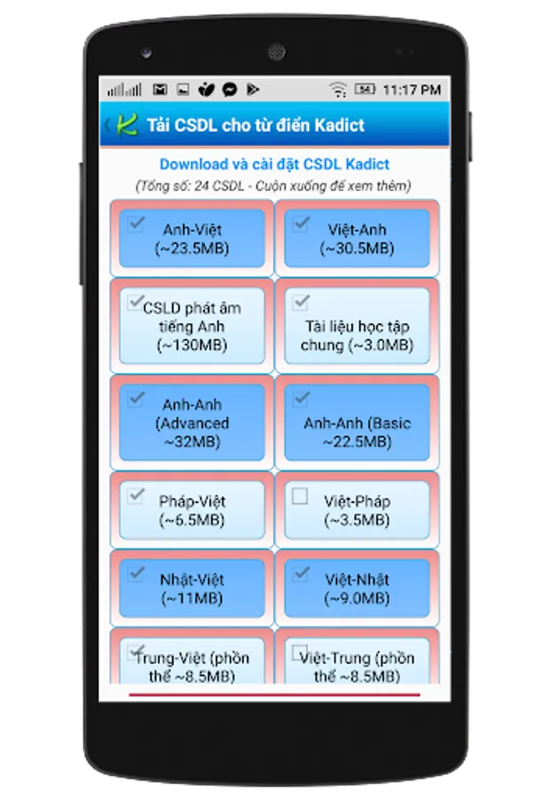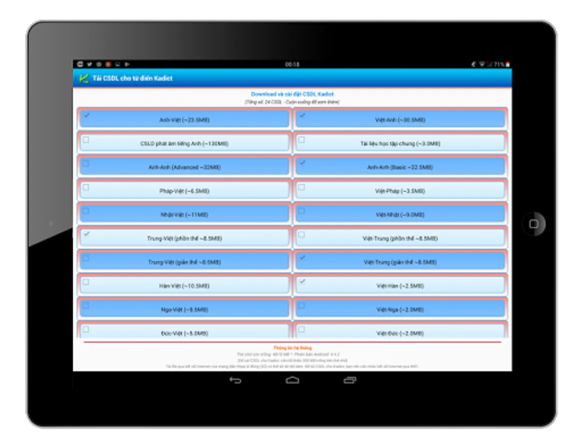 - Kadict consists of the following databases: English-Vietnamese-English, French-Vietnamese-French, Japanese-Vietnamese-Japanese, Chinese-Vietnamese-Chinese, Russian-Vietnamese-Russian, Korean-Vietnamese-Korean and English Talking database. Typically, the English-Vietnamese and Vietnamese-English ones have aproximately 390,000 and 430,000 entries respectively including not only everyday words and phrases but also terms of various areas such as business, finance, technology, natural sciences, etc.